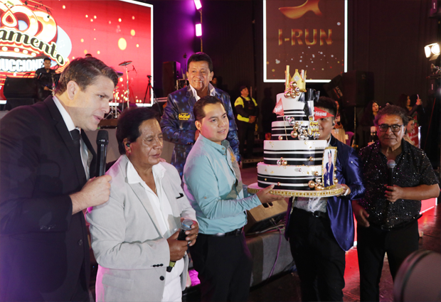 Marcos y Jeampierre subieron al estrado con la torta y varias velitas para que el rey de la jarana sople y pida un deseo.Seguro que Sósimo pidió salud, y harta vida para seguir cantando a su lindo público